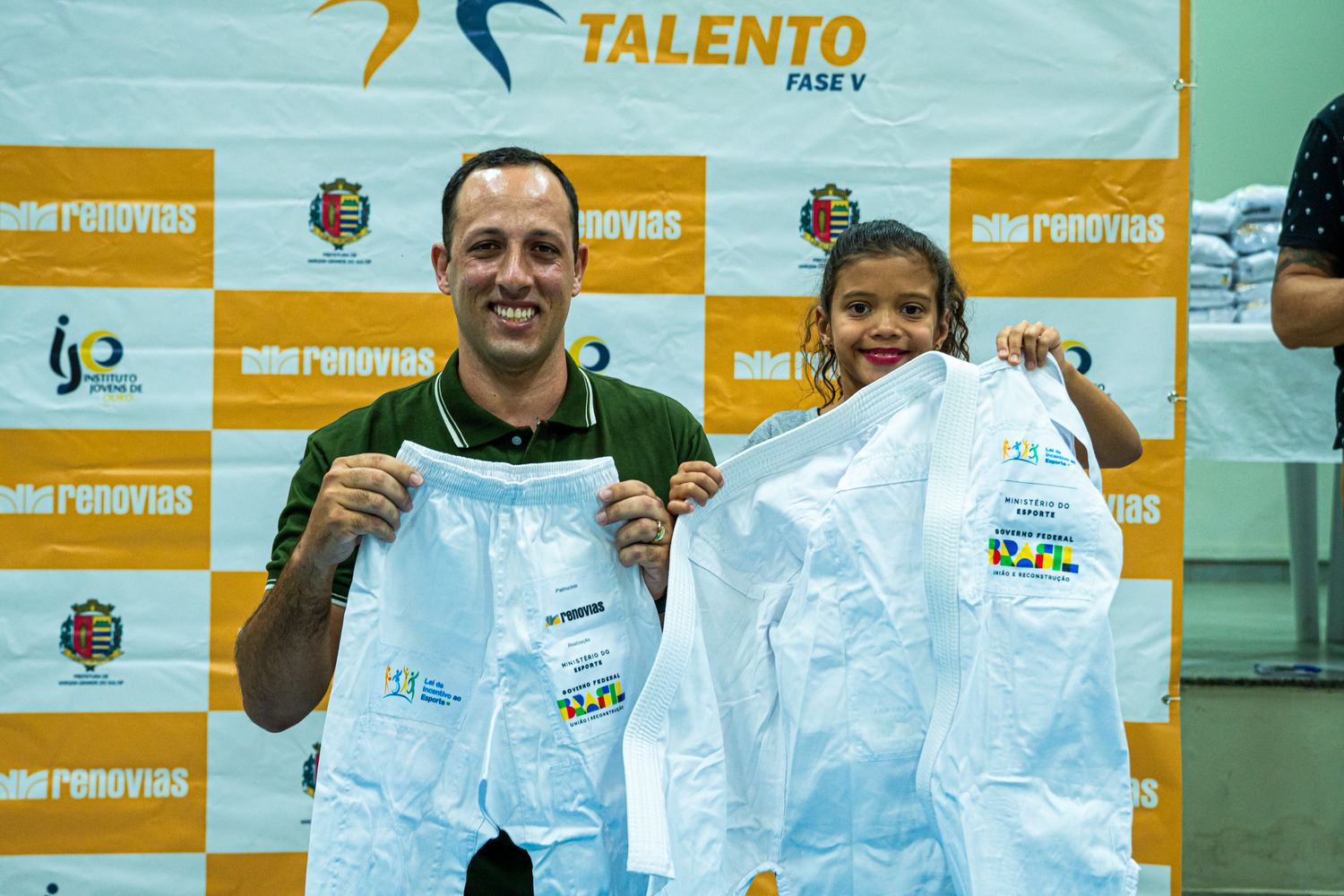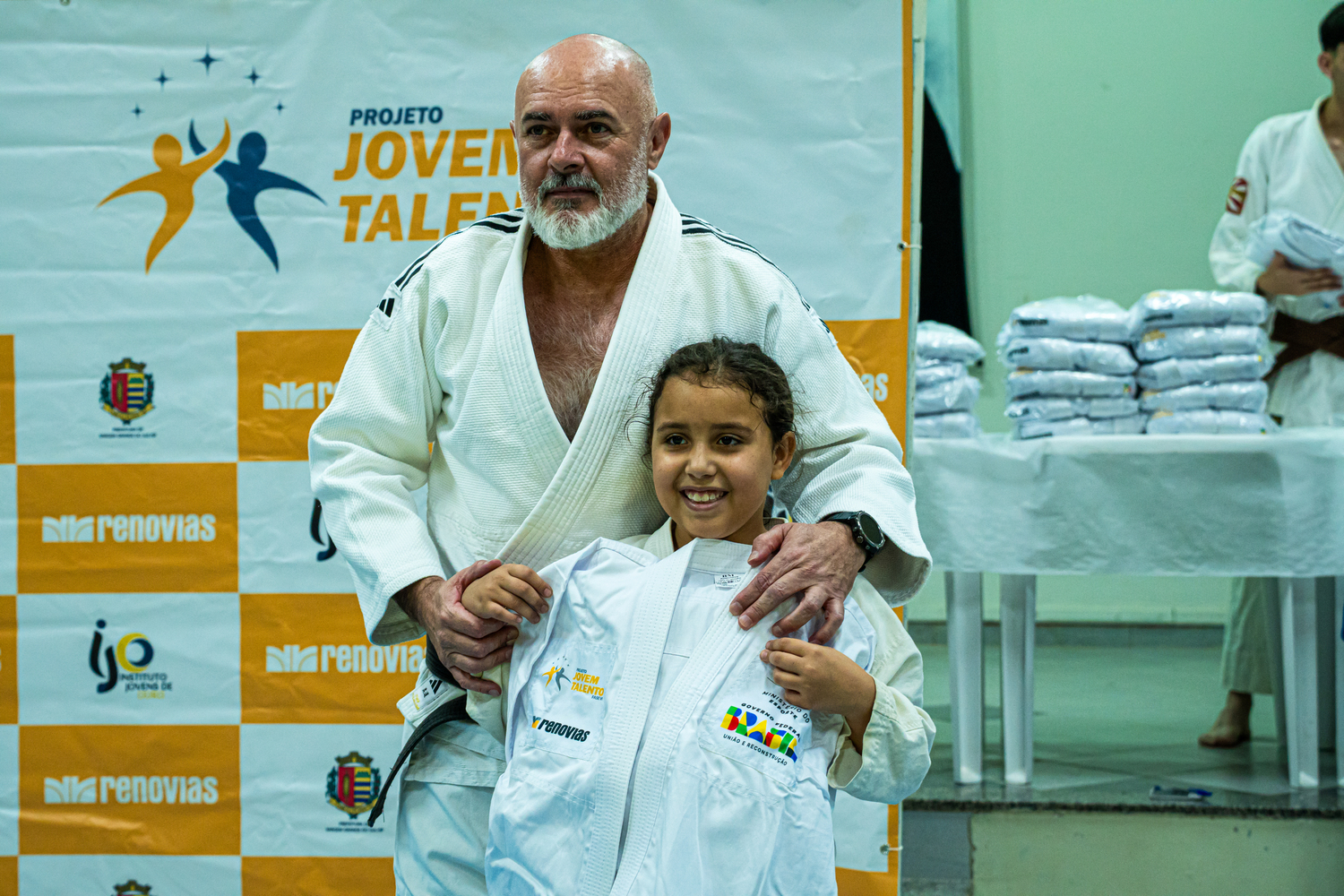 Na quarta-feira, 18 de setembro, os alunos do Projeto Jovem Talento VI de Vargem Grande do Sul viveram um momento especial com a cerimônia de entrega de novos kimonos. O evento aconteceu no tradicional Clube XXI de Abril e reuniu alunos, familiares e autoridades locais em uma tarde marcada por emoção, reconhecimento e valorização do esporte. Estiveram presentes na cerimônia o Vice-Prefeito de Vargem Grande do Sul, Guilherme Nicolau; o Diretor de Esportes, André Leoni; o representante do Instituto Jovens de Ouro, Fabricio Oliveira; e o sensei do projeto, Daniel Silva. A participação das lideranças reforçou a importância da iniciativa e demonstrou o apoio ao trabalho realizado no município por meio do judô. O projeto é realizado através do patrocínio da Renovias, por meio da Lei de Incentivo ao Esporte. Seu apoio garante não apenas a manutenção das aulas de judô, mas também a entrega de materiais esportivos adequados, que fortalecem o aprendizado e motivam os alunos. Para os alunos, receber o kimono representa um símbolo de disciplina, respeito e dedicação às aulas. Os familiares acompanharam com orgulho a conquista dos jovens, que vêm se desenvolvendo por meio do esporte.